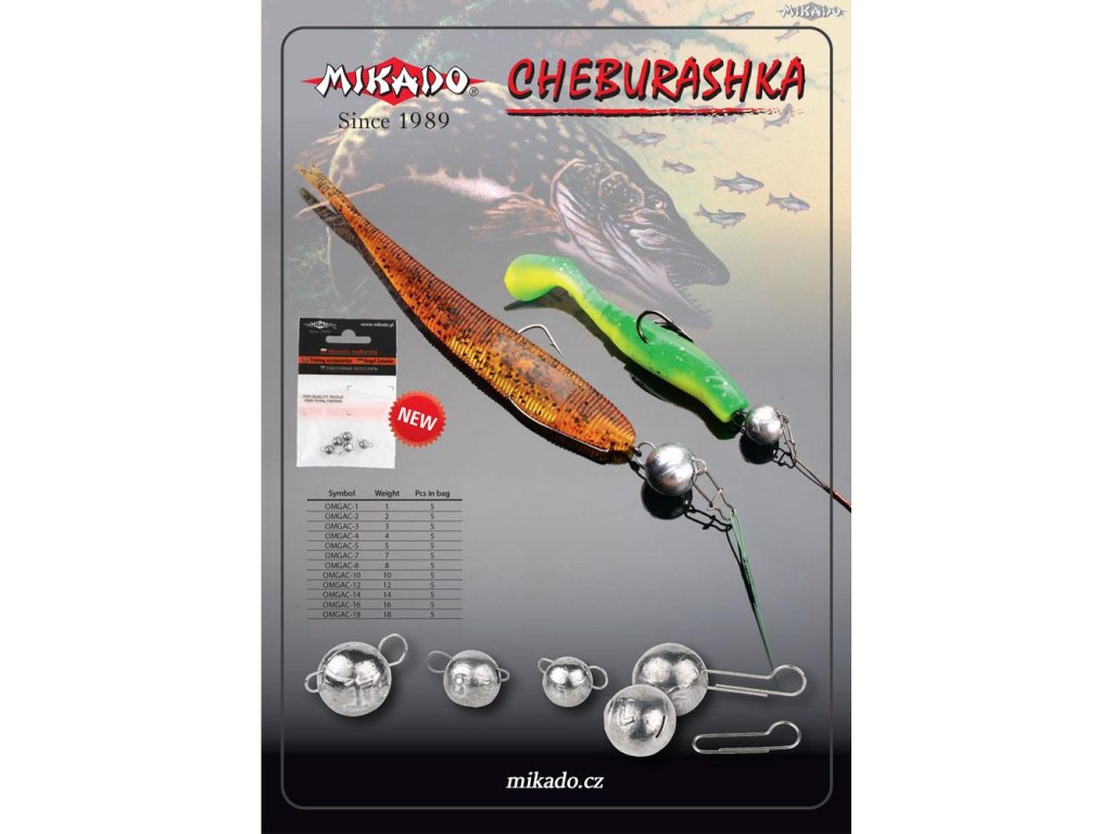 «Czeburaszka» je systém zatížení vláčecích nástrah skládající se z vyjímatelné karabiny a kulaté zátěže. Pro nazbrojení nástrahy je potřeba připnout očko dvojháčku, nebo háčku na karabinu a potom vložit karabinu do zátěže tak aby její konce vyčnívaly po obou stranách. Potom stačí karabinu od lanka připnout do vzniklého očka na druhé straně. Díky tomuto systému zbrojení není háček procházející nástrahou pevně spojen se zátěží což umožňuje její volný pohyb - díky čemu je její práce mimořádně nepravidelná a přirozená. Ideální ke zbrojení dvojháčky SENSUAL s prodlouženým dříkem, nebo také offsetovými háčky (např : JAWS OFFSET, SENSUAL OFFSET WORM ). Čeburašky MIKADO vynikají kvalitou zpracování a především použitím kvalitního odolného drátu při konstrukci sponky. Každá součást Vaší sestavy je důležitá, proto klademe mimořádný důraz na kvalitu každého detailu.