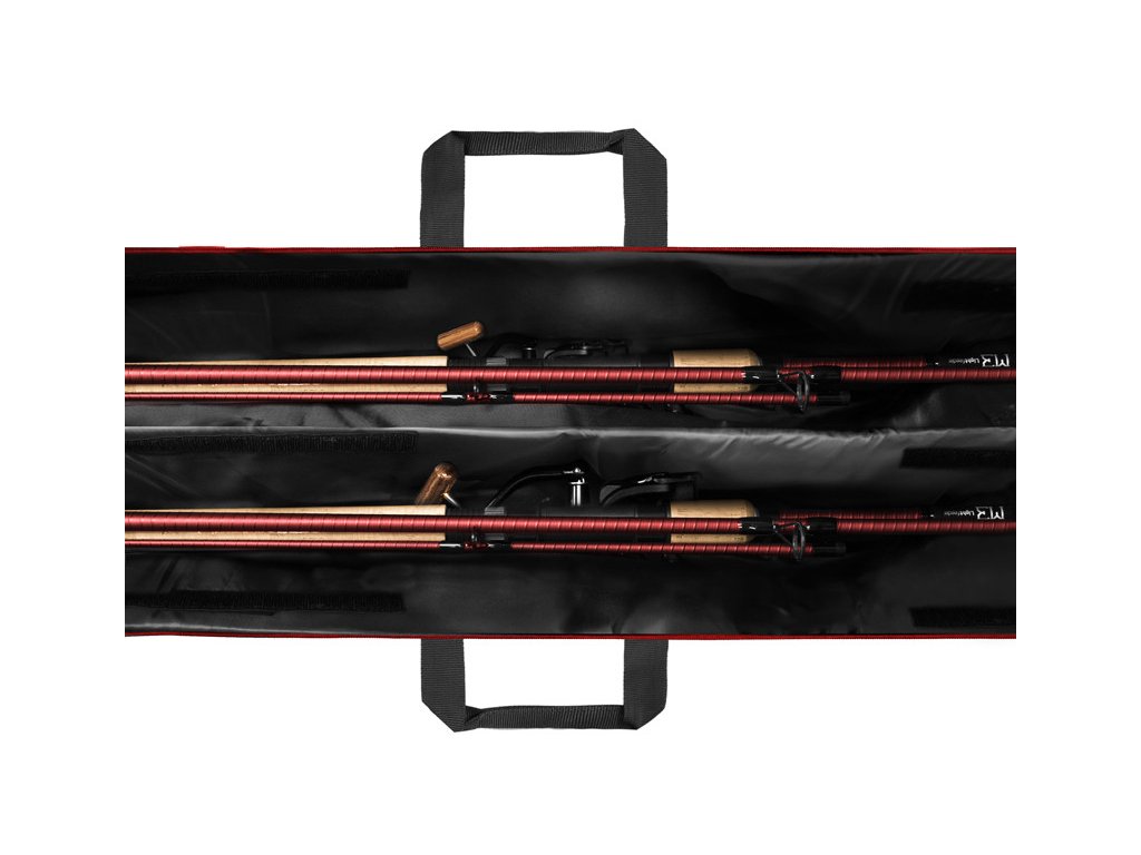 Pouzdro je na všech stěnách včetně předělovací přepážky plně polstrované 6mm měkkou výstelkou. Tím pádem nehrozí při transportu 2 prutů jejich vzájemné poškození. Díky rozšířené části pro uložení navijáků se dovnitř vejdou všechny standardně používané feedrové sestavy.