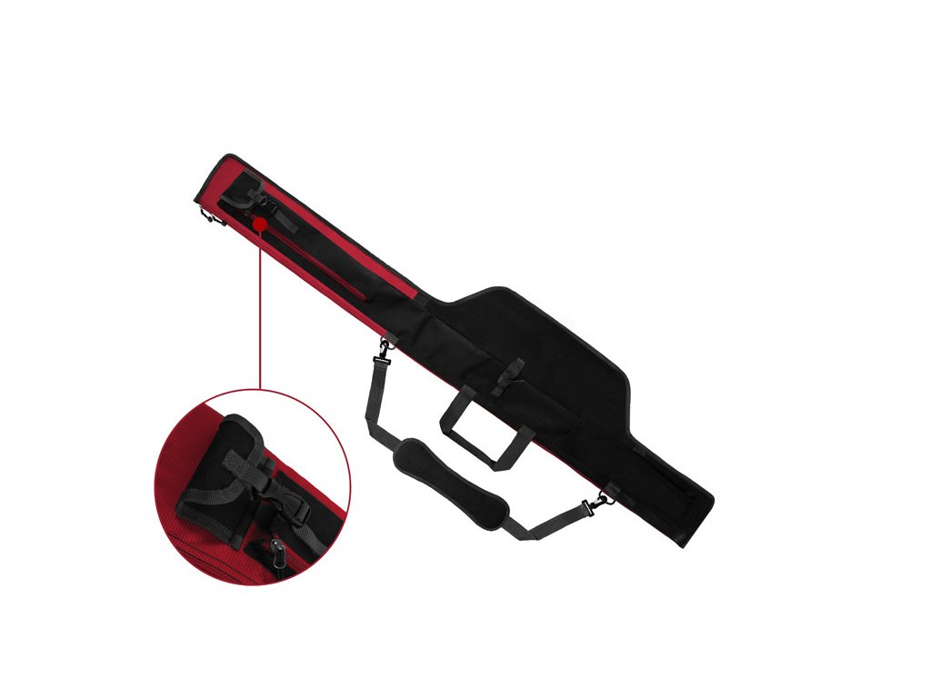 Pouzdro je navrženo v černé barvě s typickými bordó doplňky a je vyrobeno z velmi odolné textilie, která bez problémů odolá slabšímu dešti či vlhkosti způsobené rosou. Ve spodní části je navíc odolný, nepromokavý materiál umožňující postavení pouzdra i na mokrou zem, aniž by došlo k jeho znehodnocení.