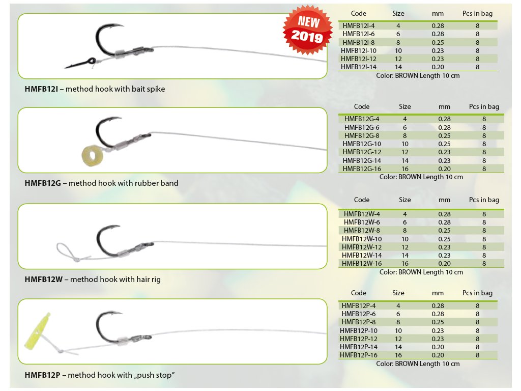 Kompletní návazce pro Method feeder. Verze - s vlascem a háčky s protihrotem, v různých variantách uchycení pelet. Kompletované na vysoce jakostním vlasci, se super ostrými háčky.