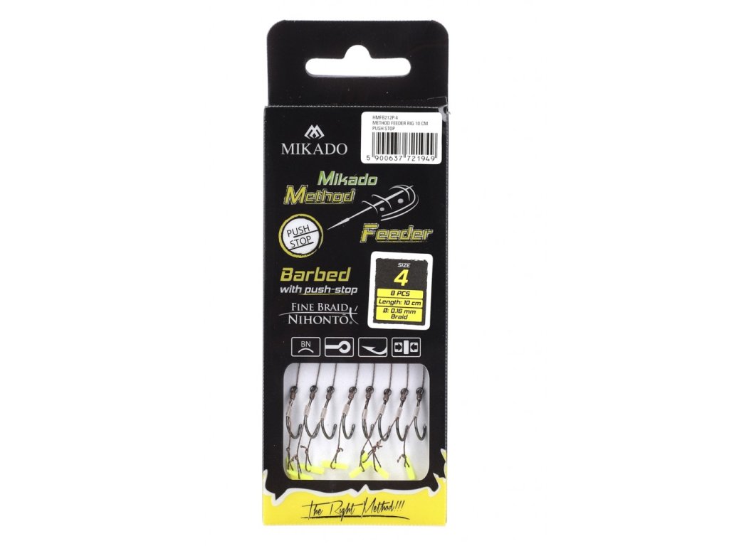 Kompletní návazce pro Method feeder. Verze - s vlascem a gumkou na pelety, s háčky s protihrotem. Kompletované na vysoce jakostní pletené šňůře Fine Braid, se super ostrými háčky.
