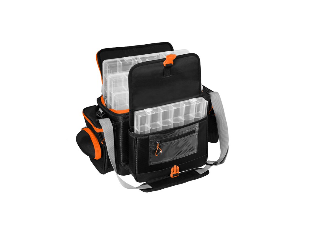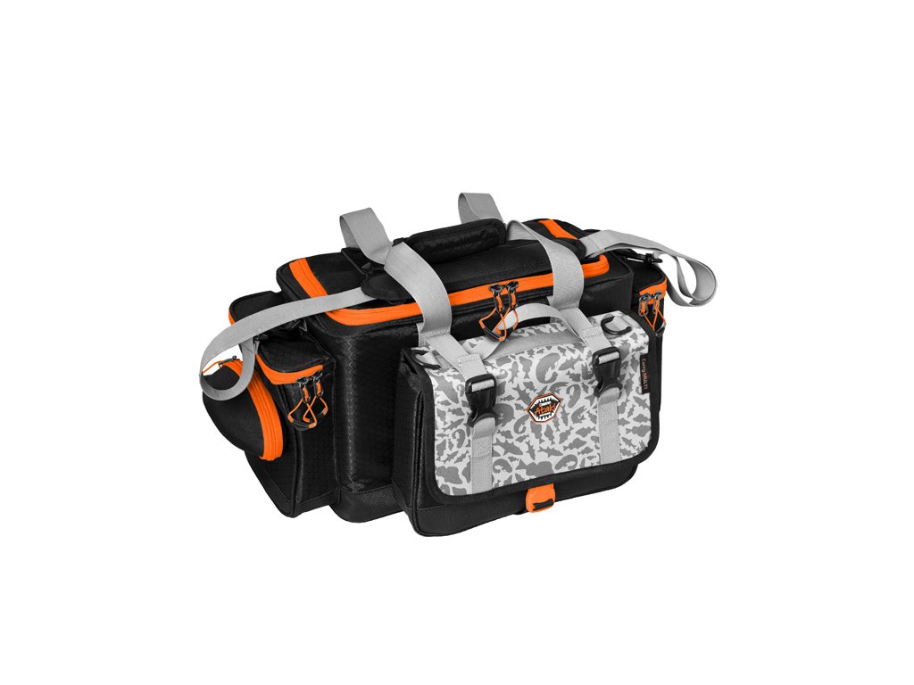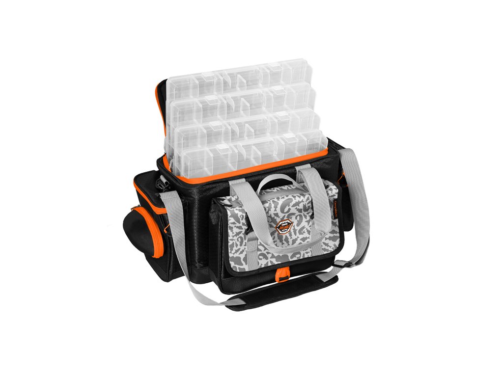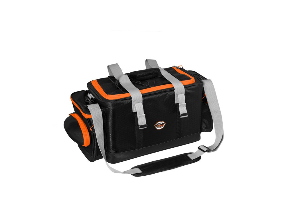 Kvalitní vnější zipy oranžové barvy jsou vybaveny plastovými taháčky na oranžovém popruhu, který je na konci rozšířený, a proto je možné ho rychle uchopit. Doplňky oranžové barvy umožňují rybáři, aby byla taška dobře viditelná i za šera a věděl ji okamžitě najít. Taška je ušita z lehké, ale přitom odolné látky černé barvy. Tašku lze nosit pomocí ramenního popruhu nebo dvou ručních popruhů šedé barvy. Design tašky doplňuje naše jedinečná šedá ATAK! kamufláž se siluetami dravých ryb.
