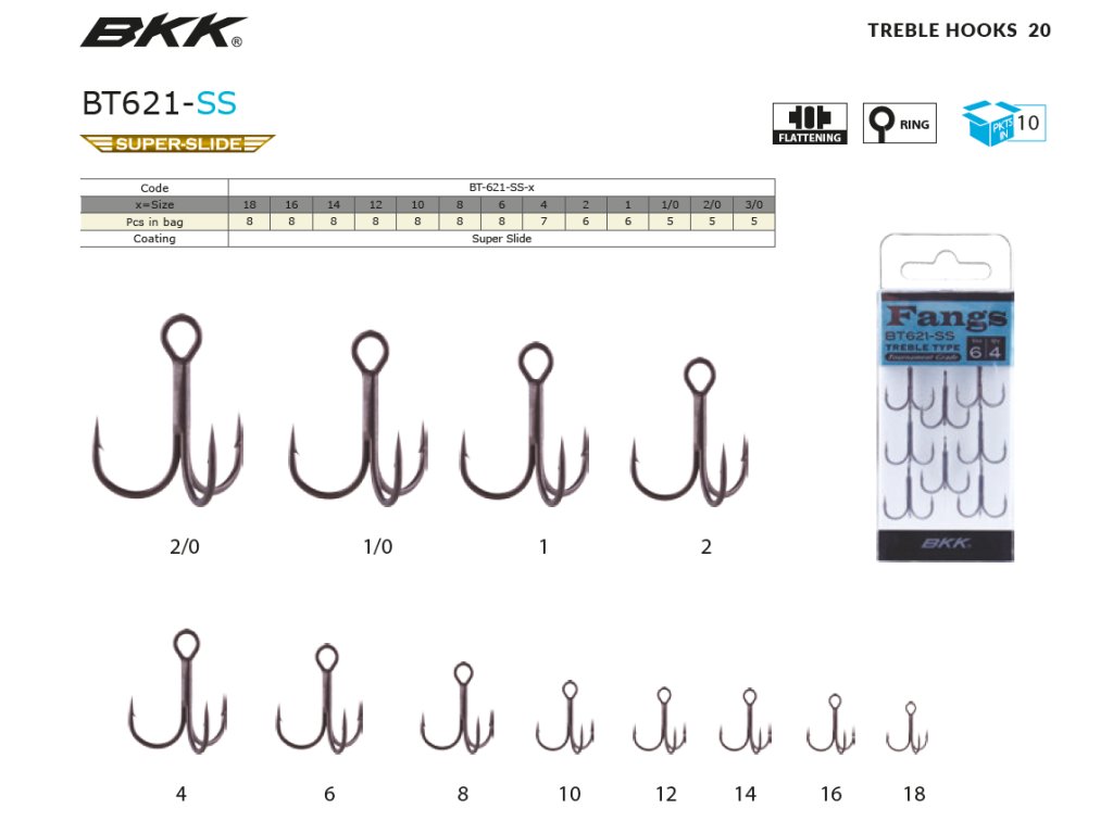 BKK SS (super slide) - jsou vynikající trojháčky s povrchem v technologii super slide, která zvyšuje kvalitu penetrace výrazným snížením koeficientu tření. Testy prokázaly, že při použití technologie Super Slide je potřebná jen malá síla pro kvalitní zabodnutí se do pysku ryby. Povrch Super slide sice zajišťuje určitou odolnost na účinky slané vody. Nicméně je především určen pro lov ve sladkých vodách.