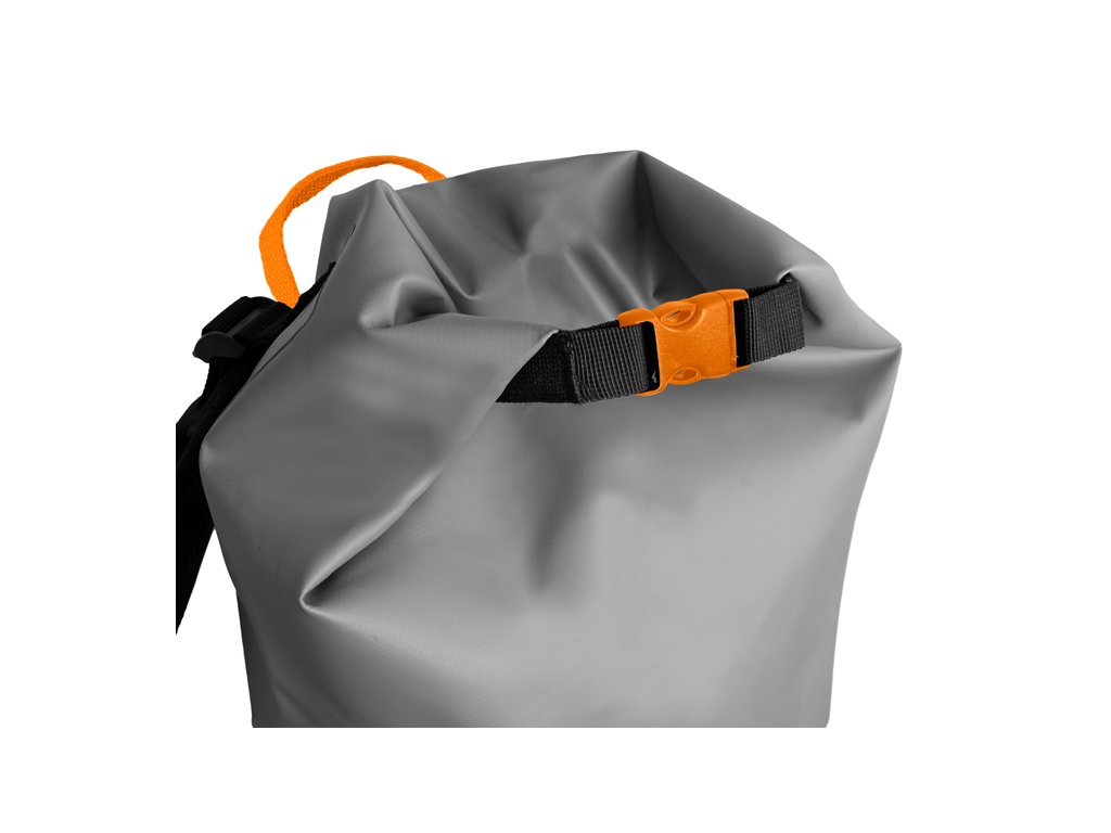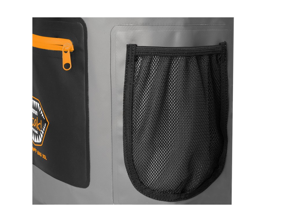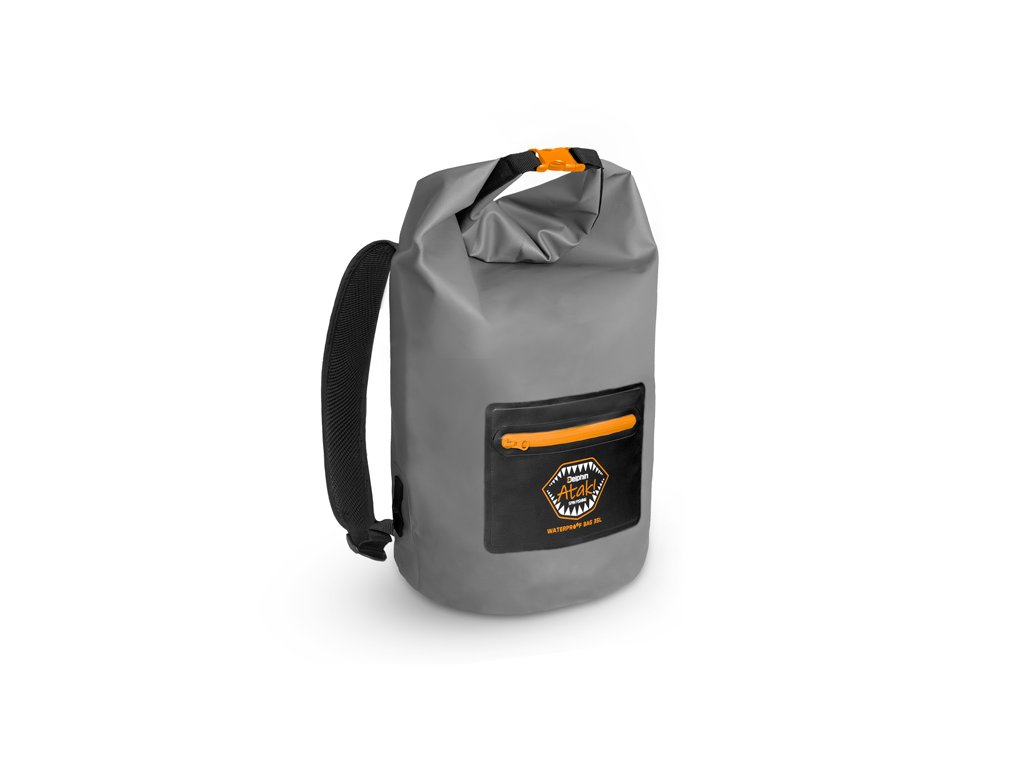 Voděodolný batoh Delphin ATAK! WB-35L je dokonalým společníkem do nepříznivého počasí. Je to praktický batoh jednoduché konstrukce a doplněn o odkládací prostory, aby spolehlivě sloužil a ochránil vaše cenné předměty před vodou a vlhkem. Dostupný je v matné šedé barvě doplněné oranžovými prvky, který je snadno rozpoznatelný, a proto je vhodný kromě rybolovu i na ostatní outdoorové aktivity. Má polstrované ramenní popruhy a zádovou část s logem Delphin černé barvy a doplněn je o praktické ucho oranžové barvy na nošení v ruce. Vpředu se nachází vodotěsná kapsa s oranžovým zipem a na boku najdeme držák na láhev. Uzavírání vrchní části je možné pomocí rolovacího zapínání s 1 přezkou oranžové barvy. Vnitřní prostor je doplněn o jednu kapsu na drobnosti. Jeho objem je 35l.Doplňkové parametry